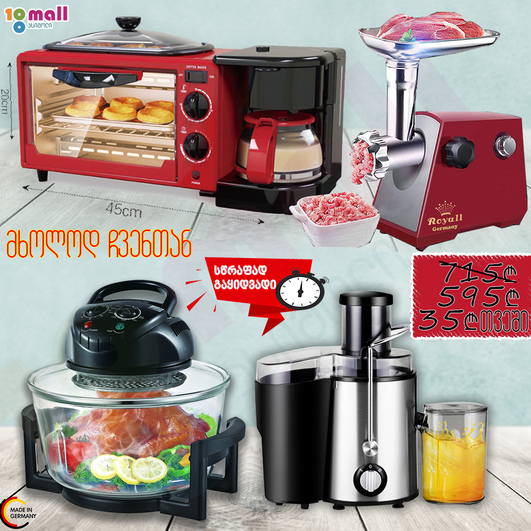 საოჯახო ტექნიკის ნაკრები (საუზმის აპარატი,ხორცის მანქანა,გრილი,წვენსაწური)
